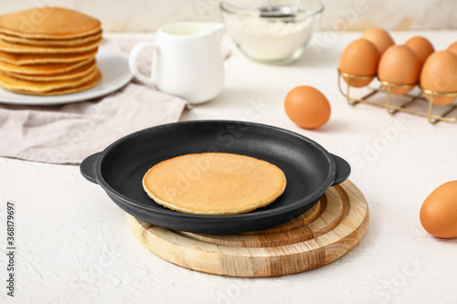 Frying pan with tasty pancake on table