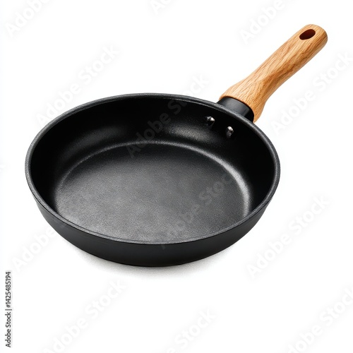Frying pan with wooden handle angled isolated on white background
