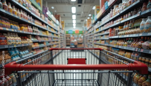 fThe grocery aisle in the middle of the shopping cart is vacant in the foreground