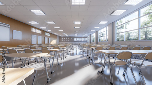 full 360 degree panorama environment map of empty abstract white classroom with chairs and tables 3d render illustration hdri hdri vr style