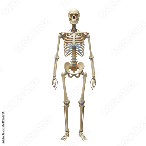 Full anatomical view of the human skeleton, showcasing detailed bone structure against a black background.