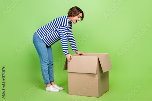 Full body cadre of young shocked woman open mouth crazy reaction carton box unpacking relocation items isolated on green color background