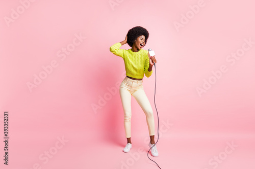 Full body photo of attractive person hand on head sing dance have fun green sweater isolated on pink color background