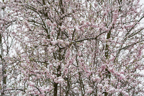 Full flowering almond tree in snowfall. The branches and the flower of the tree were covered with snow.