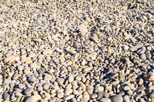 Full frame close up of numerous natural smooth pebbles covering a sunlit beach surface.