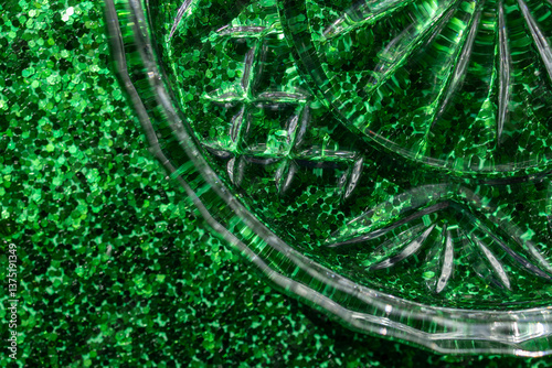 Full frame macro abstract texture background of a crystal glass coaster on sparkling green glitter surface with copy space