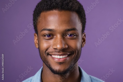Full framed very close face portrait of a smiling young african american man with violet eyes looking at the camera, studio shot,violet background.