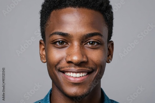 Full framed very close face portrait of a smiling young african american non binary with gray eyes looking at the camera, studio shot,gray background.