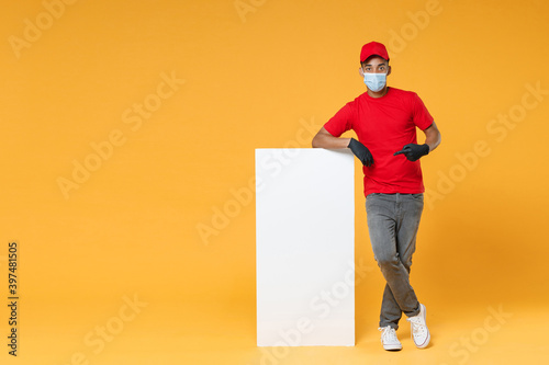 Full length delivery employee african man in red cap t-shirt face mask gloves work courier dealer service hold big white empty blank billboard for promo copy space isolated on yellow background studio