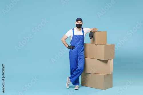 Full length delivery man in cap t-shirt uniform sterile face mask gloves isolated on blue background studio Guy employee courier hold box Service pandemic coronavirus virus covid-19 2019-ncov concept.