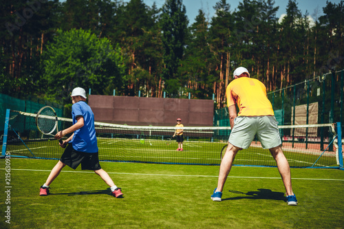 Full length little boy and man playing tennis with competitor. They turning back to camera while locating opposite net outside