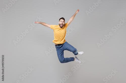 Full length of young bearded student smiling happy cheerful overjoyed man 20s in yellow basic t-shirt jump high looking camera flying outstretched hands isolated on grey background studio portrait..