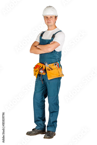 Full length portrait of a male builder in with helmet over white wall background. repair, construction, building, people and maintenance concept.