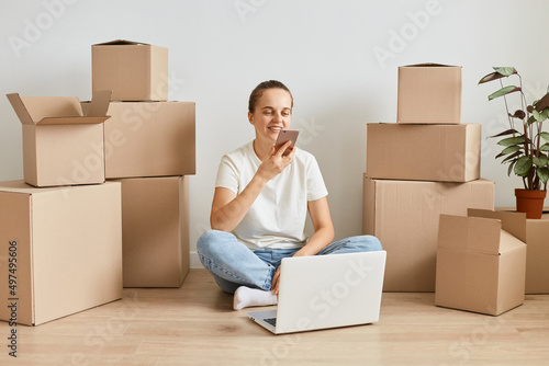 Full length portrait of Caucasian woman wearing white t shirt and jeans sitting on floor surrounded with cardboard boxes and using smart phone for recording voice messages.