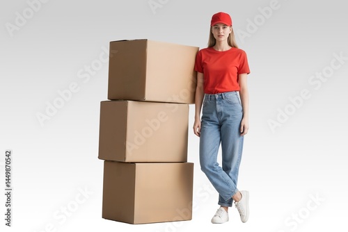 full length portrait of delivery woman in red cap t-shirt isolated on white background female courier or dealer standing near empty cardboard boxes receiving package copy space for advertisement conce