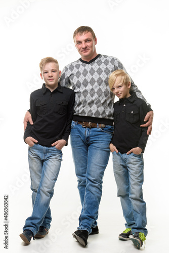 Full length portrait of father and two sons in casual clothes, isolated on white background