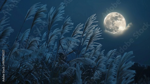 Full moon illuminating feather grass on a serene night, capturing the beauty of nature under moonlight in a tranquil, ethereal scene.