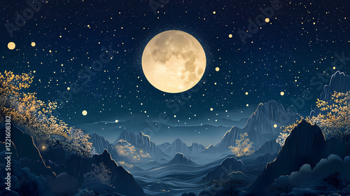 Full moon in night starry sky. Midnight Horizon. Illustration
