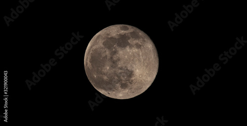 full moon in the black sky background. Photo taken with big telephoto zoom lens from Earth