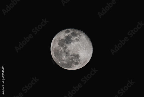 Full moon over dark black sky at night with telephoto lens isolated on transparent background.