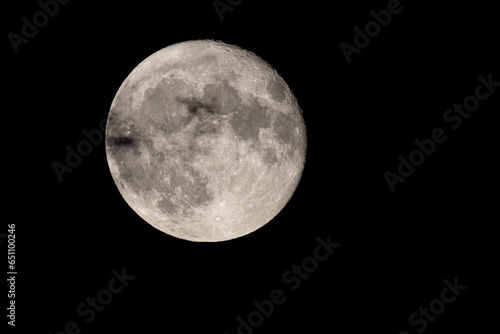 full moon photographed with a telescope and reflex camera where you can see the craters on the lunar surface, it is covered by clouds. Destination for space travel and future moon landings
