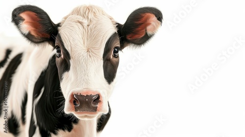 Fullbodied cow with striking black spots stands elegantly against a clean white backdrop, showcasing its unique pattern.