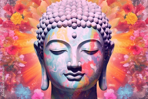 Full-faced and detailed Buddha's head on a colorful background. digital art collage ,Generative AI