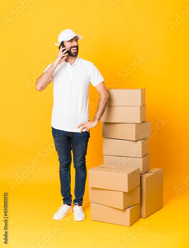 Full-length shot of delivery man among boxes over isolated yellow background keeping a conversation with the mobile phone