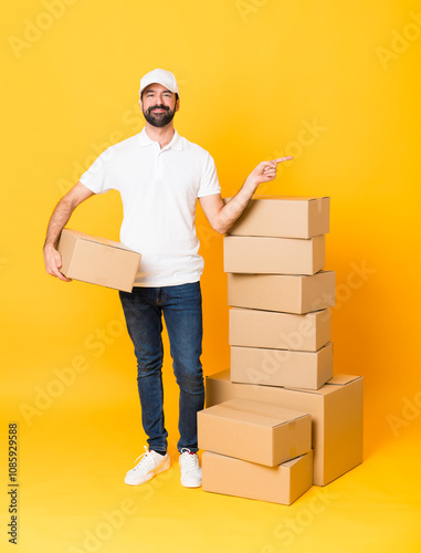Full-length shot of delivery man among boxes over isolated yellow background pointing finger to the side