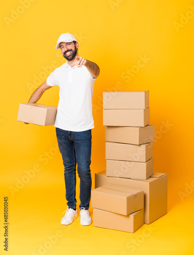 Full-length shot of delivery man among boxes over isolated yellow background points finger at you with a confident expression