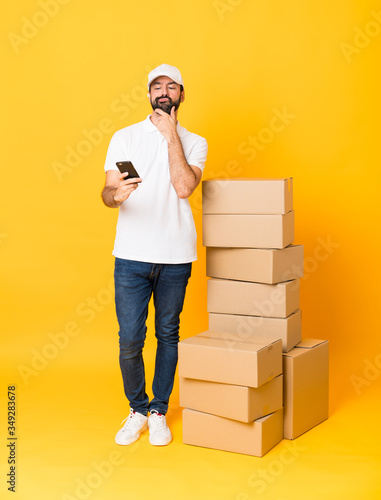 Full-length shot of delivery man among boxes over isolated yellow background thinking and sending a message