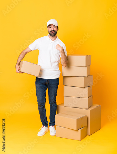 Full-length shot of delivery man among boxes over isolated yellow background with surprise facial expression