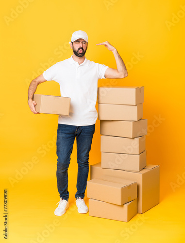 Full-length shot of delivery man among boxes over isolated yellow background with tired and sick expression