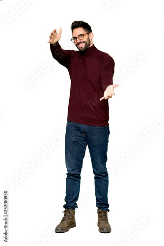 Full-length shot of Handsome man with glasses presenting and inviting to come with hand on isolated white background