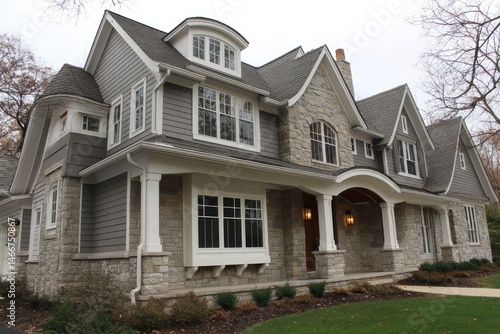 Full-width home with window bays and stone siding base --ar 3:2 --v 7 Job ID: f0a2ca4a-8901-4a09-bf80-d847b7b95cd3