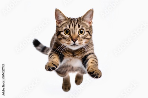 funny cat flying. photo of a playful tabby cat jumping mid-air on the grass looking at camera. background with copy space
