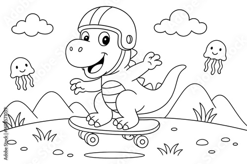 Funny dinosaur wearing a helmet, riding a skateboard with floating jellyfish around in a scenic outdoor view. coloring page