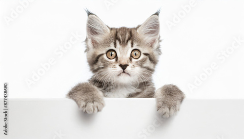 Funny gray tabby kitten showing placard with space for text. Lovely fluffy funny cat holding signboard on isolated background. Top of head of cat with paws up, peeking over a blank white banner.