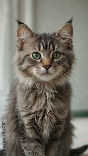 Funny long-haired gray kitten with big green eyes licking its lips on a white table.