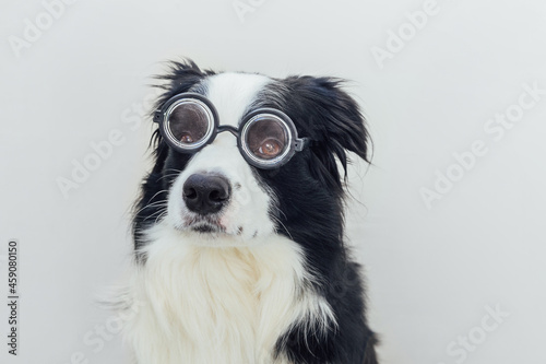 Funny portrait of puppy dog border collie in comical eyeglasses isolated on white background. Little dog gazing in glasses like student professor doctor. Back to school. Cool nerd style. Funny pets