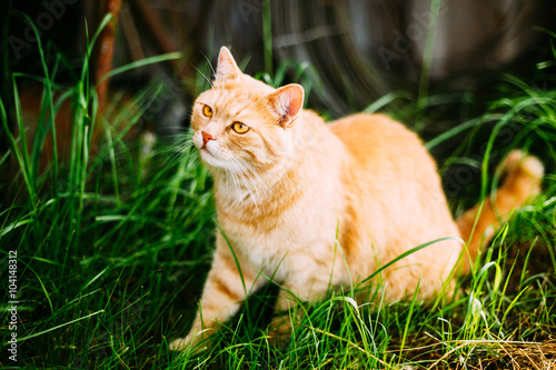 Funny Red Cat Playing in Green Spring Grass In Garden