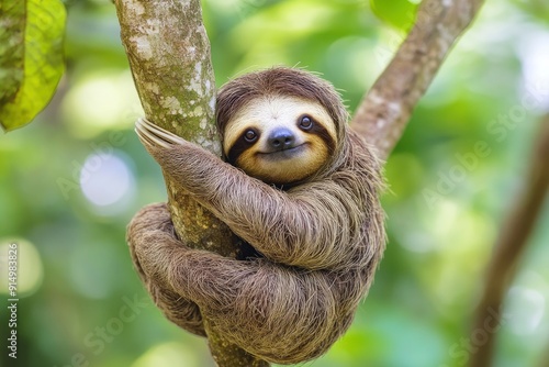 Funny sloth hanging on tree branch, cute face look, perfect portrait of wild animal in the Rainforest of Costa Rica scratching the belly, Bradypus variegatus, brown-throated three-toed sloth, ai