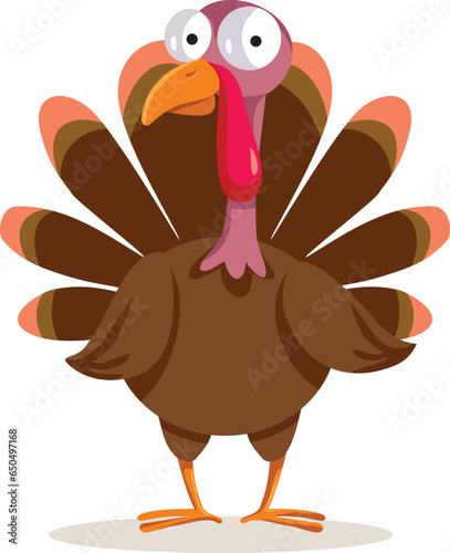 Funny Vector Turkey Bird Celebrating Thanksgiving. Cartoon Mascot. Happy domestic gobbler bird standing and smiling