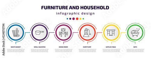 furniture and household infographic template with icons and 6 step or option. furniture and household icons such as waste basket, small saucepan, dining room, sump pump, gateleg table, bath vector.