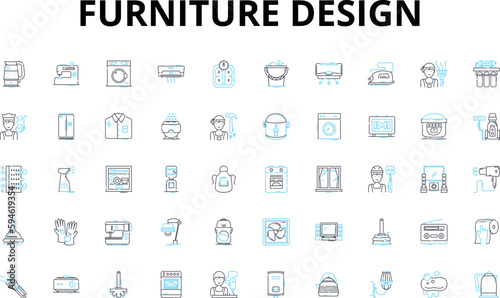 Furniture design linear icons set. Ergonomics, Minimalism, Modularity, Sustainability, Functionality, Aesthetics, Craftsmanship vector symbols and line concept signs. Innovation,Comfort,Timelessness