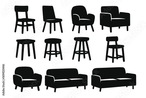 Furniture icon set vector silhouette. Minimalist collection of chairs, stools, sofas, and armchairs. Home decor elements for interior design. Black flat graphic objects.