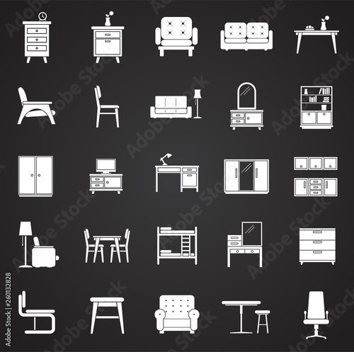 Furniture icons set on black background for graphic and web design. Simple vector sign. Internet concept symbol for website button or mobile app.