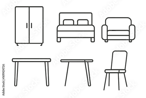 Furniture line icon set. Wardrobe, bed, sofa, table, chair symbols for interior design. Minimalist outline pictogram collection for web, apps, and infographics. Editable vector.