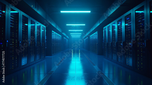 Future concepts: data centers, intelligent warehouses, digitized lines of information flowing through servers. SAAS, cloud computing, Web services