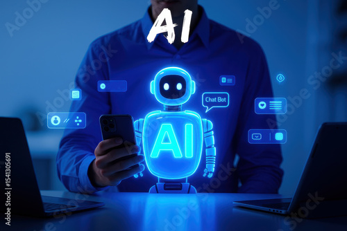 Future of AI: A person at a desk interacts with an AI bot. Seamless digital interaction underscores the potential of artificial intelligence to transform business, and the world.